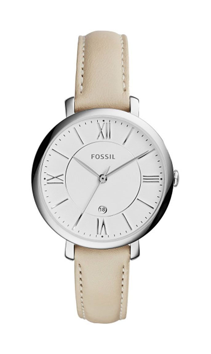 Fossil Jacqueline ES3793 -kellossa on valkoinen nahkaranneke ja hopeanvärinen ruostumattomasta teräksestä valmistettu runko. Kellon rungon leveys 36 mm ja paksuus 7 mm. Rannekkeen leveys kiinnityskohdasta 14 mm. Fossil-kelloille myönnetään 2 vuoden takuu ja ne toimitetaan valmistajan alkuperäisessä rasiassa.