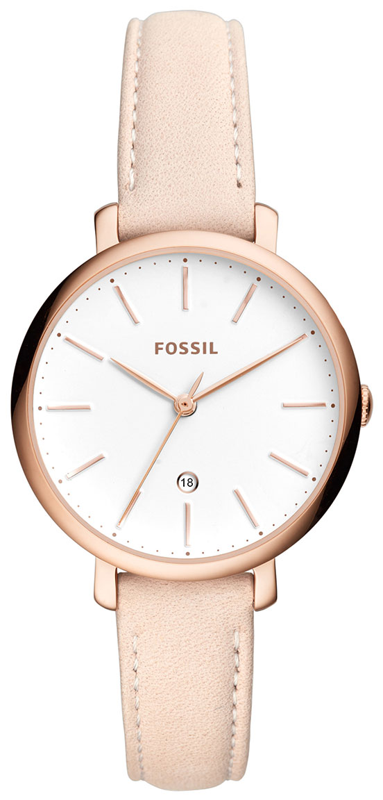 Fossil Jacqueline ES4369 -kellossa on hempeä vaaleanpunainen nahkaranneke ja punakullanvärinen ruostumattomasta teräksestä valmistettu runko. Kellon rungon leveys 36mm ja paksuus 7mm. Rannekkeen leveys kiinnityskohdasta 14mm. Fossil-kelloille myönnetään 2 vuoden takuu ja ne toimitetaan valmistajan alkuperäisessä rasiassa.