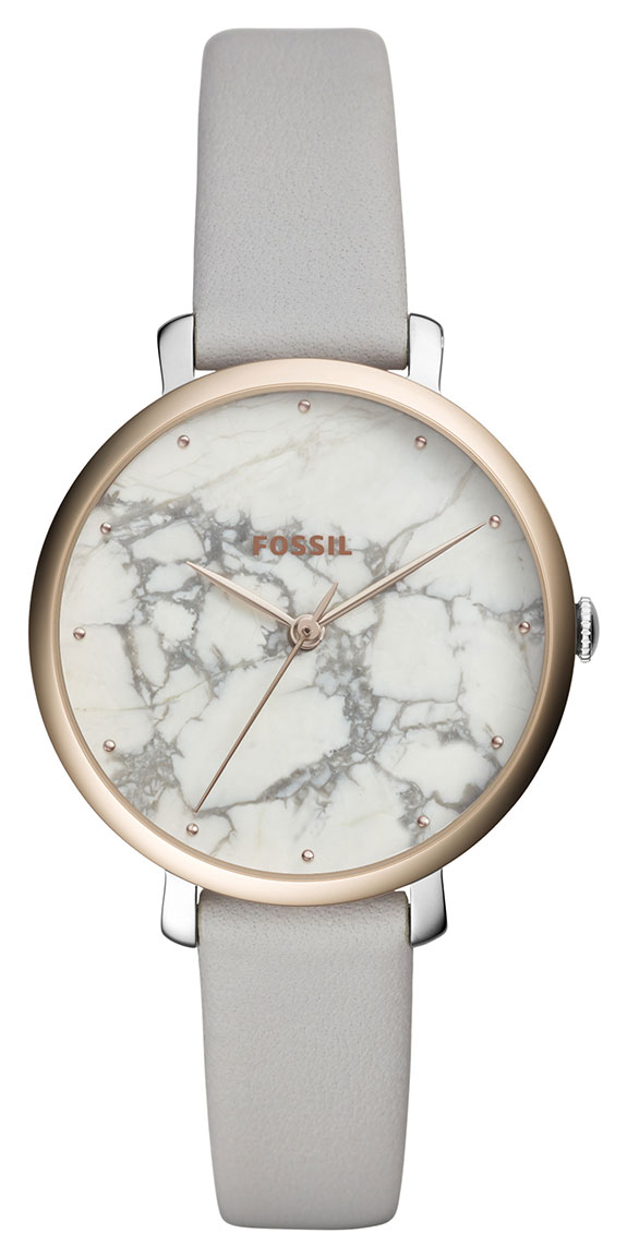 Fossil Jacqueline ES4377 -kellossa on muodikas harmaa nahkaranneke ja kaksivärinen teräsrunko. Kellon rungon leveys 36 mm ja paksuus 7 mm. Rannekkeen leveys kiinnityskohdasta 14 mm. Kellotaulu on kauniisti marmoroitu. Fossil-kelloille myönnetään 2 vuoden takuu ja ne toimitetaan valmistajan alkuperäisessä rasiassa.