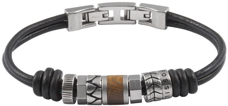 Miesten Fossil JF84196 rannekoru. Rannekoru on valmistettu nahkanauhasta ja ruostumattomasta teräksestä. Korun pituus on säädettävissä 22,5cm ja 21cm. Riipusosan pituus on n.5cm. Koru toimitetaan valmistajan alkuperäisessä rasiassa.