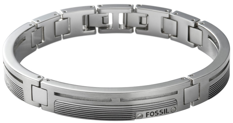 Miesten Fossil JF84476 rannekoru. Koru on valmistettu ruostumattomasta teräksestä ja se on hopean värinen. Rannekorun paksuus on 10mm ja halkaisija 7cm. Koru toimitetaan valmistajan alkuperäisessä rasiassa.