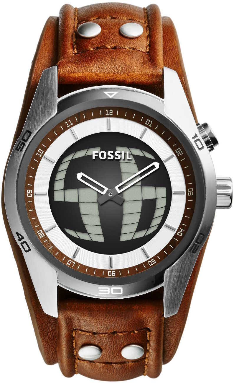 Miesten Fossil JR1471 rannekello. Kellon rungon leveys on 44mm ja rannekkeen 22mm. Runko on valmistettu ruostumattomasta teräksestä ja se on väriltään hopea/harmaa. Kellossa on ruskea nahkaranneke, joka tulee kellon rungon alta. Kellossa ei ole sekuntiosoitinta vaan sekunnit näkyvät kellon digitaalisessa kellotaulussa. Fossil kelloille myönnetään 2 vuoden takuu. Kello toimitetaan valmistajan alkuperäisessä rasiassa postikuluitta!