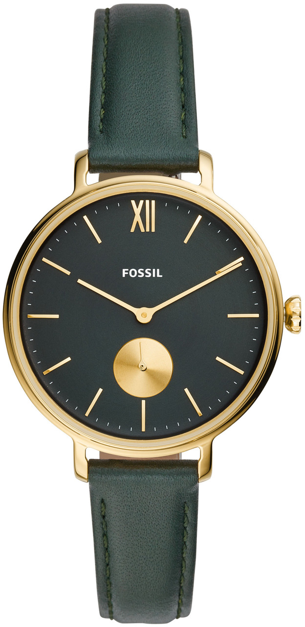Fossil Kalya Dark green ES4662 sopii tyyliin kuin tyyliin riippumatta siitä oletko vapaa-ajalla tai matkalla juhliin. Kellossa on moderni ilme, syvänvihreä sunray-taulu, roomalaiset indeksit ja ohuet osoittimet. Kellon alareunassa on erillinen näyttö sekuntiajalle. Kullanvärisen rungon leveys on 35 mm, paksuus vain 7 mm, ja ranneke on miellyttävää vihreää nahkaa. Rannekkeen kiinnitykohdan leveys on 13 mm, ja rannekkeen pituus on 14-20 cm. Kaikilla Fossil-kelloilla on 2 vuoden takuu, ja ne toimitetaan valmistajan alkuperäisessä rasiassa.