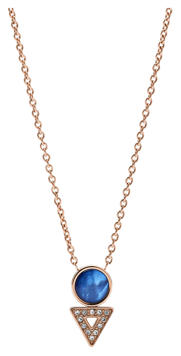 Fossil Geometric Rose-Gold-Tone Stainless Steel JF03013791 -kaulakoru on valmistettu ruostumattomasta teräksestä. Ruusukullanvärisessä korussa on sinistä helmiäistä ja kimaltelevia korukiviä. Ketjun pituus on noin 40,5 - 45,5 cm. Fossil-korut toimitetaan valmistajan alkuperäisessä rasiassa.
