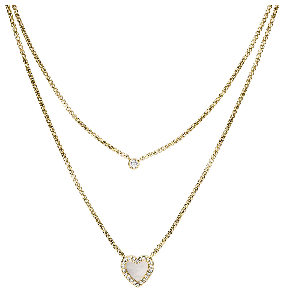 Fossil Heart Duo JF03217710 on kaunis kullanvärinen ruostumattomasta teräksestä valmistettu naisten kaulakoru. Toisessa ketjussa on ihana sydänkoru, joka on koristeltu korukivin. Toisessa ketjussa riippuu yksittäinen korukivi. Korun pituus on 400-450 mm. Lukkona on kätevä hummerilukko. Fossil-korut toimitetaan valmistajan alkuperäisessä pakkauksessa.