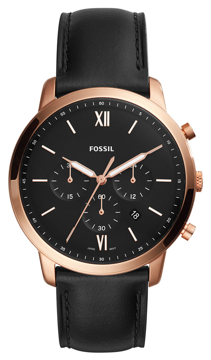 Fossil Neutra Chronograph FS5381 -kellossa on iso musta 44 mm leveä kellotaulu, suoraviivaiset roomalaiset indeksit ja viisarit, ja ranneke on mustaa nahkaa. Kellotaulua suojaa hieman kupera lasi, joka viimeistelee kellon vintage-ilmeen. Luminoinnin ansiosta osoittimet ja indeksit näkyvät myös pimeässä. Kellon ominaisuuksiin kuuluu päivyri, 24 tunnin kello ja ajanotto, joita on helppo säätää kellon sivussa olevista painikkeista. Rannekkeen kiinnityskohdan leveys on 22 mm, ja pituus 16-21,5 cm. Kaikilla Fossil-kelloilla on 2 vuoden takuu, ja ne toimitetaan valmistajan alkuperäisessä rasiassa.