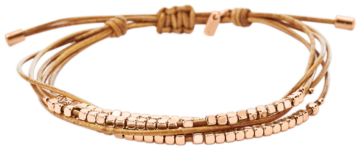 Fossil Dainty Rondel Slider JA6422791 -rannekoru on beigeä/ruskeaa nahkaa. Siinä olevat koristeet ovat ruusukullanvärisiä ja ne on valmistettu teräksestä. Rannekorun leveys on 63 mm, mutta se on säädettävissä helposti. Fossil-korut toimitetaan valmistajan alkuperäisessä pakkauksessa.