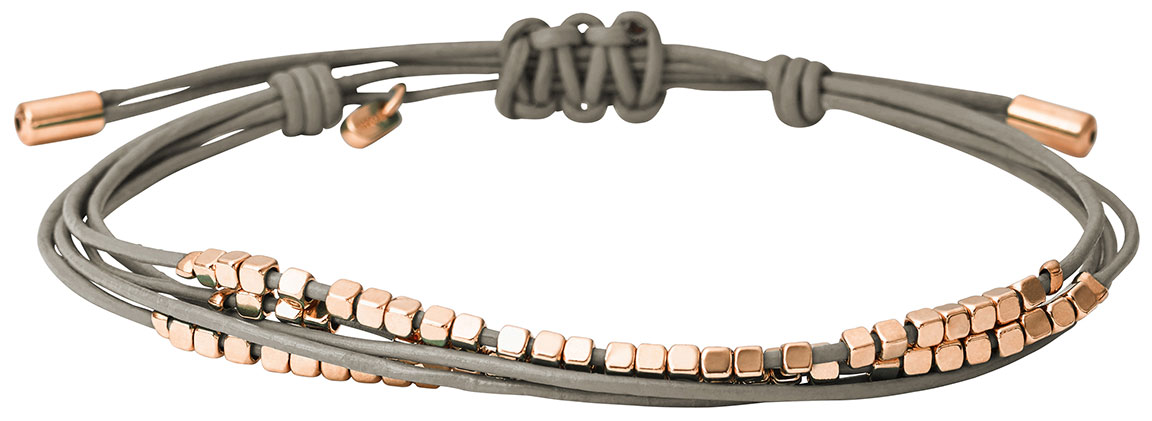 Fossil JA6534791 -rannekoru on harmaata nahkaa. Siinä olevat koristeet ovat ruusukullanvärisiä ja ne on valmistettu teräksestä. Rannekorun pituus on 190 mm, mutta sen pituus on säädettävissä. Fossil-korut toimitetaan valmistajan alkuperäisessä pakkauksessa.