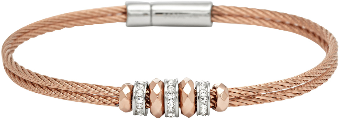 Americana henkinen Fossil rannekoru JF00991998 on punottu ruusukullansävyisestä ruostumattomasta teräksestä. Korun keskellä on useita strassikoristeita yhdessä monikulmaisten metallihelmien kanssa. Rannekorun helppokäyttöinen lukko aukeaa napista, jonka vuoksi koru on helppo pukea ylle. Rannekoru pituus n 18,5 cm:iä. Koru toimitetaan valmistajan alkuperäisessä rasiassa.