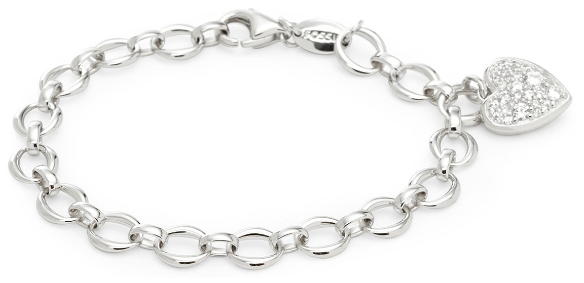 Fossil rannekoru JFS00153040 on valmistettu hopeanvärisestä ruostumattomasta teräksestä. Rannekorun pituus on säädettävissä noin 15,5-17,5 cm välille. Sydänriipuksen koko on noin 10 x 12 mm, ja se on koristeltu säihkyvin korukivin. Fossil-korut toimitetaan valmistajan alkuperäisessä rasiassa.