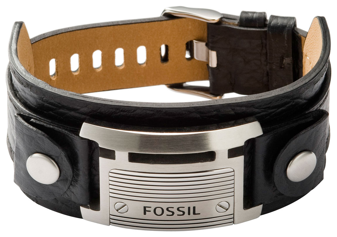 Fossil Large Black ID Cuff JF84816040 -rannekoru on valmistettu ruostumattomasta teräksestä ja mustasta nahasta. Korun pituus on säädettävissä noin 15,5 - 19,5 cm pituiseksi, ja sen korkeus on 3,8 cm. Fossil-korut toimitetaan valmistajan alkuperäisessä rasiassa.