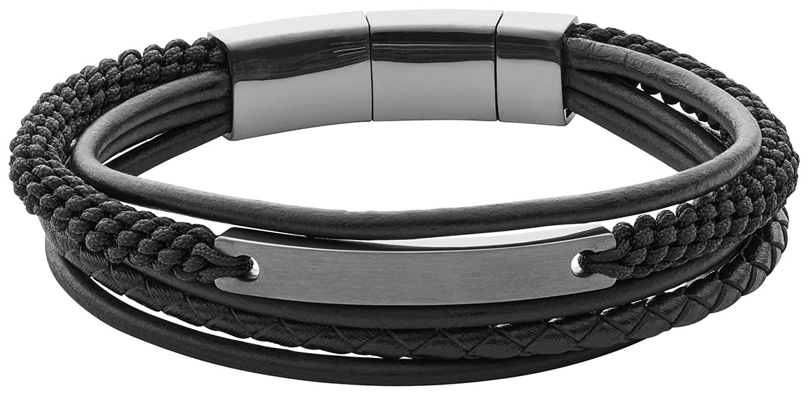 Fossil Vintage Casual Steel Multi-Strand JF02378793 -rannekoru on valmistettu mustasta nahasta ja puuvillasta, sekä harmaasta ruostumattomasta teräksestä. Rannekorun pituus on 180 + 15 mm jatkopala. Fossil-korut toimitetaan valmistajan alkuperäisessä rasiassa.