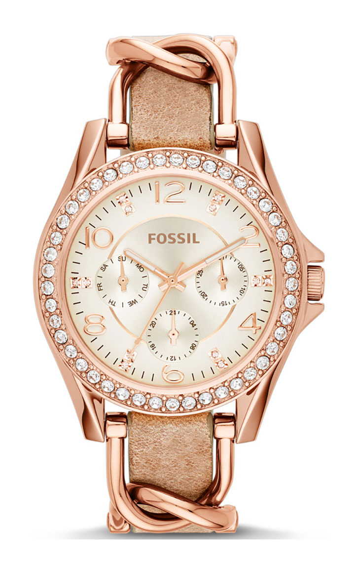 Fossil Riley ES3466 on säväyttävä kristallein koristeltu rannekello, josta löytyy omat taulunsa myös päivämäärälle ja viikonpäivälle. Tämä malli on valmistettu ruusukullanvärisestä ruostumattomasta teräksestä ja sen rungon halkaisija on 38 mm. Luminoituvat viisarit ovat mainio lisävaruste pimeässä ja kellon mineraalilasi tarjoaa lisäksi erinomaisen suojan naarmuuntumista vastaan.