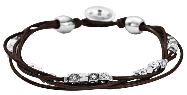 Fossil Rondel Nugt JA5798040-nahkarannekorussa on neliönmuotoisia teräshelmiä, joiden läpi kulkee useita ruskeita nahkanyörejä. Teräshelmiin on kirjailtu tähtiä, joiden keskelle on upotettu kirkkaita zirkonioita. Ranneke on tummanruskeaa nahkaa. Rannekorun pituus on 18 cm. Fossil-korut toimitetaan valmistajan alkuperäisessä rasiassa.