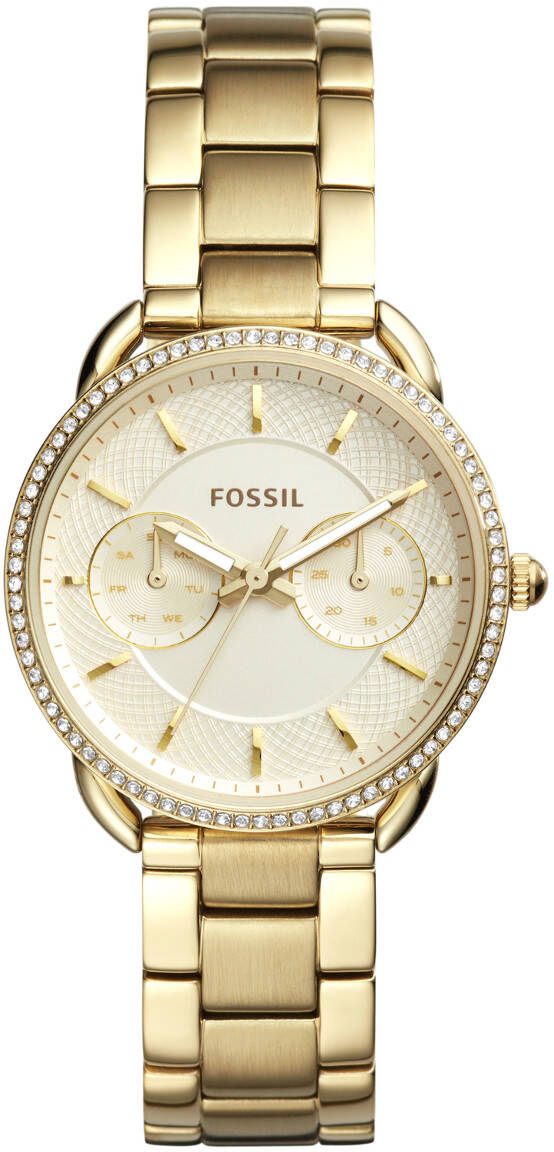Fossil Tailor ES4263-rannekello on kultaisen säihkyvä ihastus! Kellon runko ja turvalukollinen ranneke ovat valmistettu kullan väriseksi pinnoitetusta ruostumattomasta teräksestä. Kauneuden kruunaa mineraalilasilla suojattu ja zirkonia-kivillä koristeltu kellotaulu. Ominaisuuksina kellosta löytyy myös viikonpäivänäyttö sekä päivyri. Kellon rungon leveys on 34.7mm ja paksuus 9.8mm. Rannekkeen leveys kiinnityskohdassa on 16mm. Fossil kelloille myönnetään kahden vuoden takuu ja ne toimitetaan valmistajan alkuperäisessä pakkauksessa.