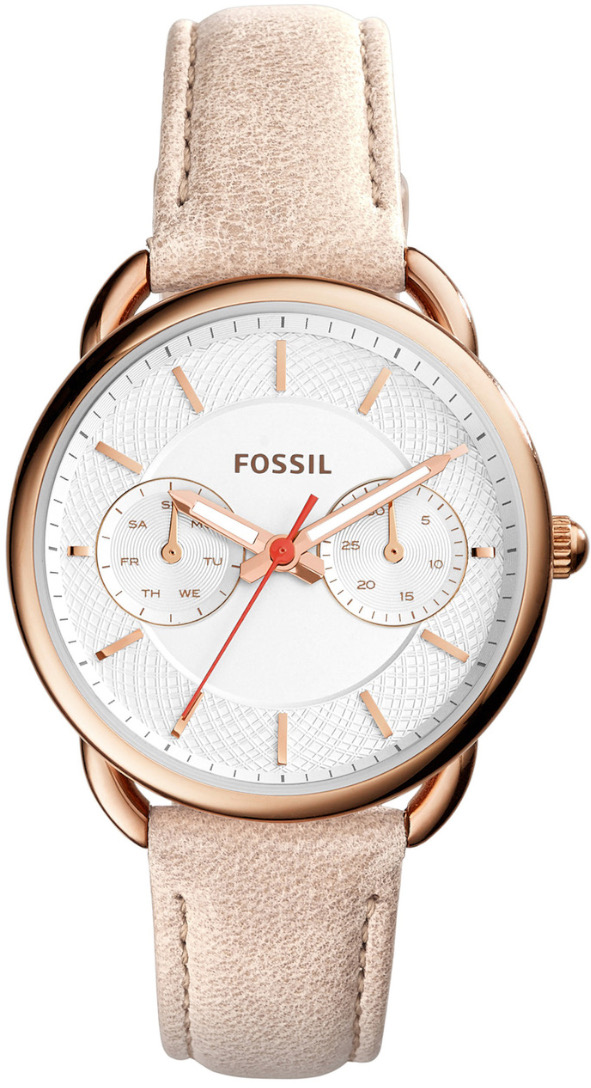 Kauniin naisellinen Fossil Tailor Multifunction ES4007-rannekello minimalistinen tyyliltään ja monipuolinen ominaisuuksiltaan. Tässä paristokäyttöisessä quartz-kellossa on erilliset näytöt viikopäiville, ja valkoinen kellotaulu on satiinihiottu ja sen reunustaa koristaa kaunis spiraalikuvio. Kellon runko ja solkilukko on ruostumatonta ruusukullansävyistä terästä, ja rungon leveys on 34 mm ja paksuus 9,8 mm. Tailorissa on miellyttävän pehmeä nappanahkaranneke, joka on helppo vaihtaa pikakiinnityksen ansiosta kotona. Rannekkeen kiinnityskohdan leveys on 16 mm ja ranneke on pituudeltaan 13,5-18 cm. Fossil-kelloilla on 2 vuoden takuu, ja ne toimitetaan valmistajan alkuperäisessä rasiassa.