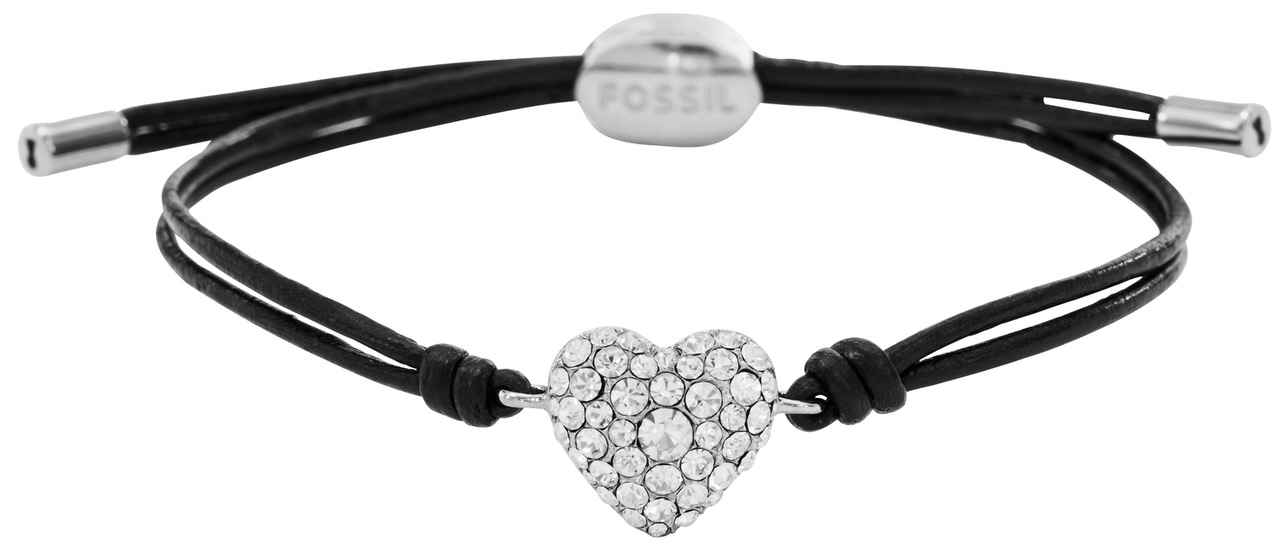 Fossil Valentine Hearts JF01206040-rannekorun keskellä on suuri briljanttihiotuin zirkonioin päällystetty sydän, joka symboloi rakkautta. Itse ranneke on mustaa nahkaa ja siinä on säädettävä vetolukko. Rannekkeen max. halkaisija on 10 cm ja sydämen halkaisija on 12,3 mm. Fossil-korut toimitetaan valmistajan alkuperäisessä rasiassa.