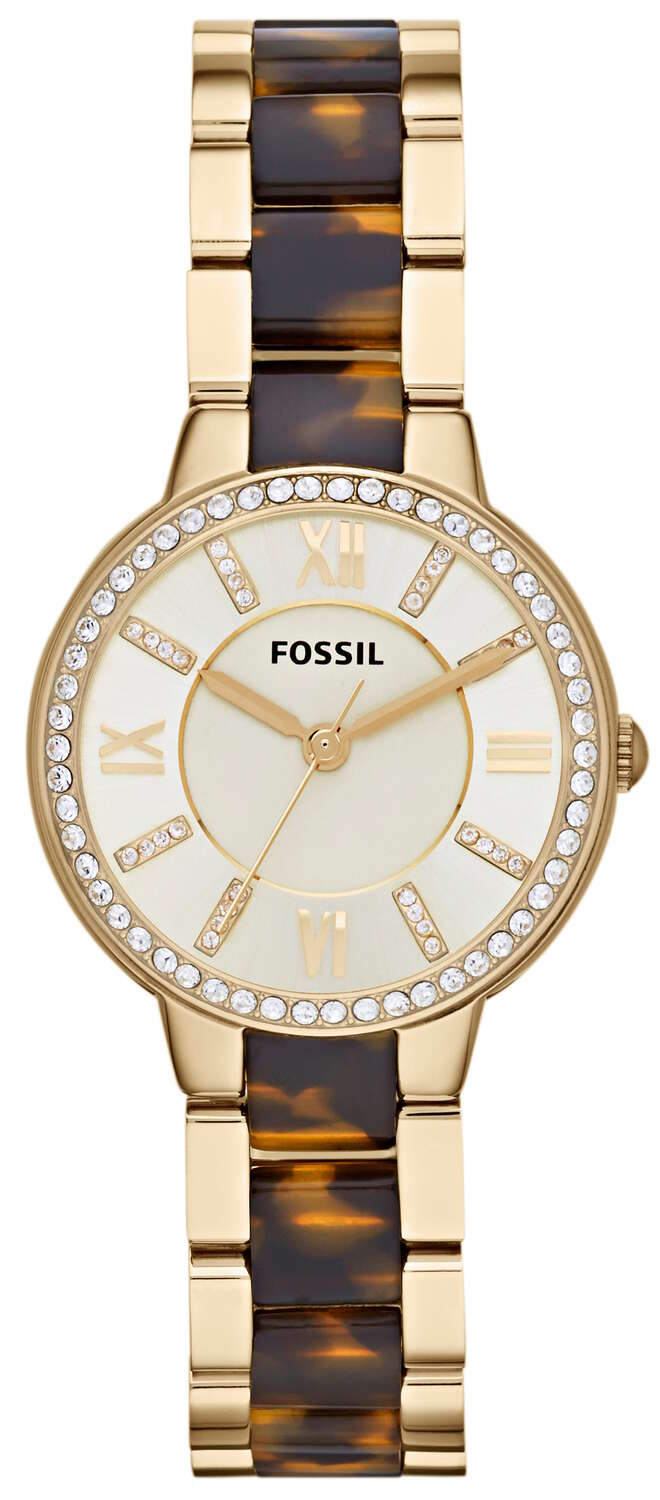 Fossil Virginia ES3314 kello on klassinen kokonaisuus jossa yhdistyy kullanvärinen runko ja ruskea kilpikonnan kilpeä muistuttava värimaailma. Kellotaulun reunustaa kiertävät synteettiset zirkoniat antaen kellolle juhlavan ilmeen.Kellon rungon leveys on 29mm ja paksuus 10mm. Fossil-kelloille myönnetään 2 vuoden takuu ja ne toimitetaan valmistajan alkuperäisessä rasiassa.