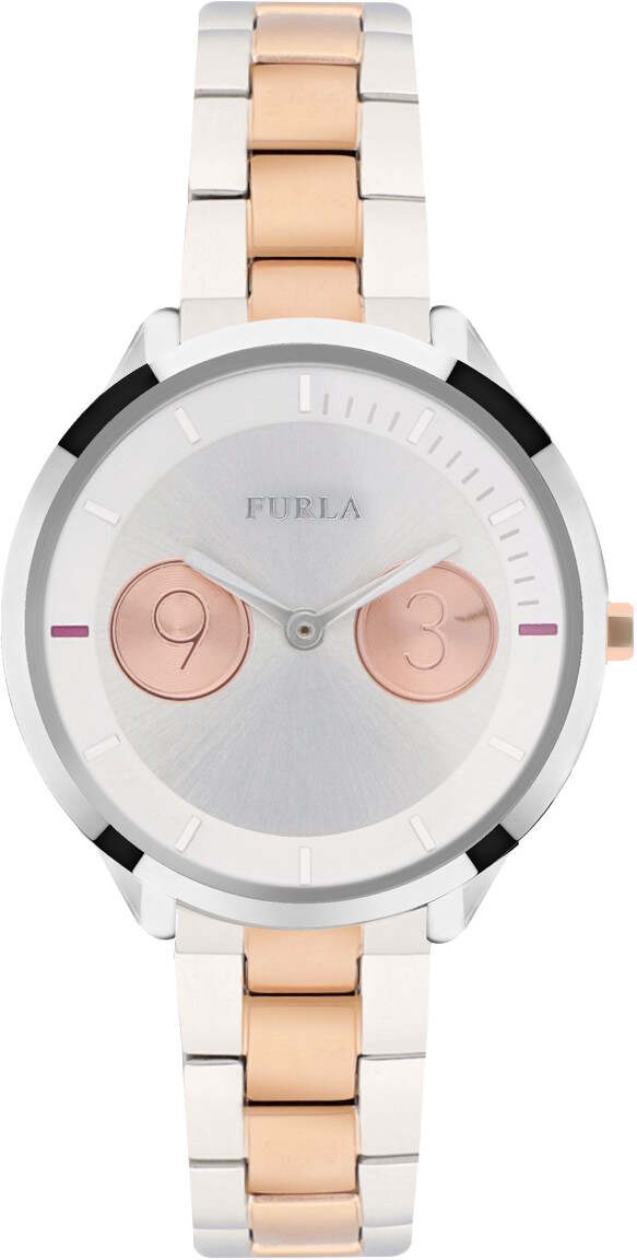 Furla Metropolis 31mm Steel and Pink Gold R4253102507 kellossa on hopean värinen runko ja kaksivärinen ranneke. Kellotaulua koristavat isot indeksit kello kolmessa ja yhdeksässä. Tämä asettelu on saanut inspiraationsa Furlan Metropolis laukun ikonisesta lukosta. Rungon leveys on 31mm. Furla kelloille myönnetään kahden vuoden takuu ja ne toimitetaan valmistajan alkuperäisessä rasiassa.