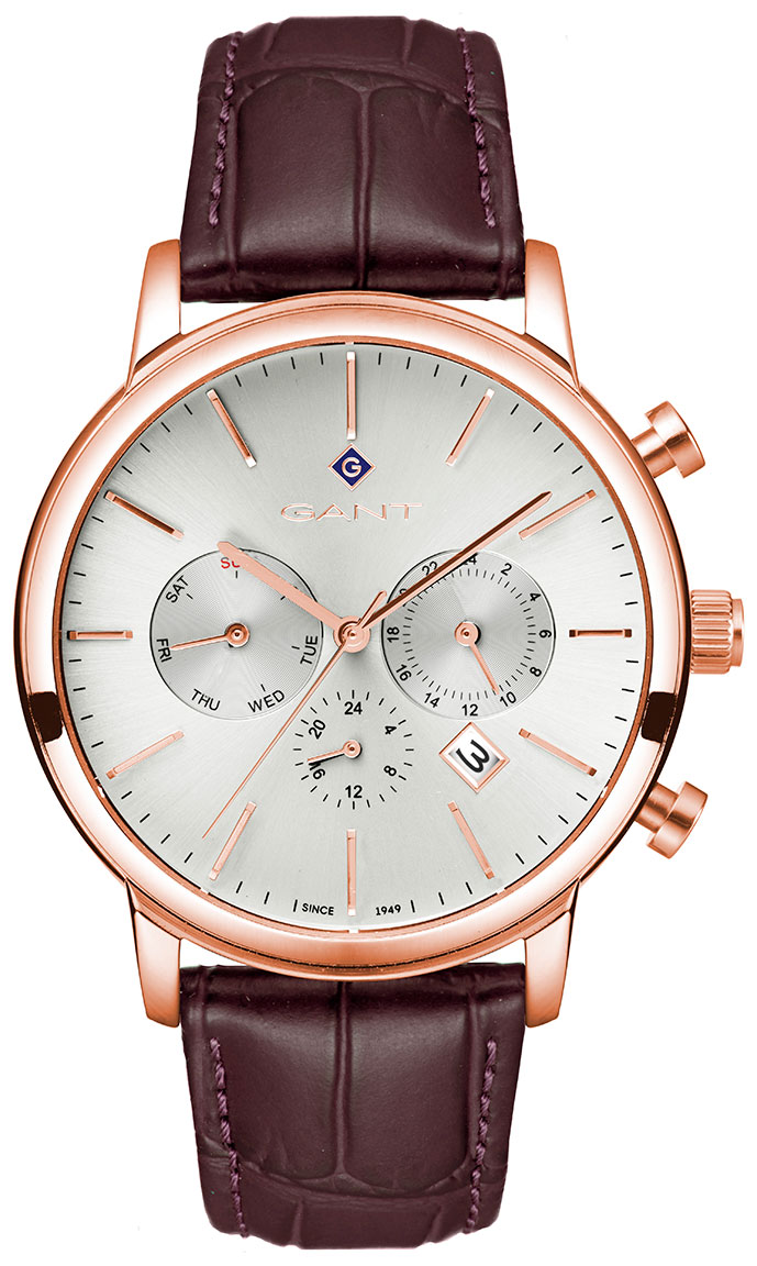 GANT Cleveland-IPR G132011 on monipuolinen ja tyylikäs miesten kello, josta on helppo seurata aikaa riippumatta siitä missä päin maailmaa kelloa pidetään, ja mutkattoman muotoilunsa ansiosta kello sopii aina asuun. Cleveland-mallissa on erilliset näytöt päivämäärälle, viikonpäivälle, ja kahdelle eri aikavyöhykkeelle. 43 mm leveässä ruusukullanvärisessä rungossa on hopea taulu, ja 22 mm leveä krokotiilikuvioitu nahkaranneke on väriltään ruskea. Gant-kelloilla on kahden vuoden takuu, ja ne toimitetaan valmistajan alkuperäisessä rasiassa.