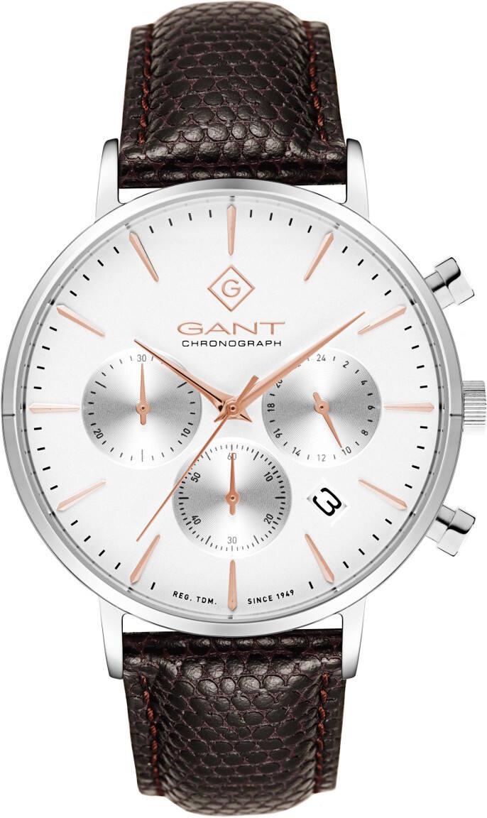 Gant Park Avenue Chrono G123001 ranteessasi pääset maistamaan seurapiirielämää vaikka omalla kotisohvallasi! Tämä ylellinen kellomalli on varustettu sekuntikellolla ja aidolla 20 mm nahkarannekkeella. 42 mm leveä runko on valmistettu ruostumattomasta teräksestä ja sen valkoista kellotaulua suojaa laadukas mineraalilasi. Mukana myös päivyrinäyttö sekä 24 h taulu.