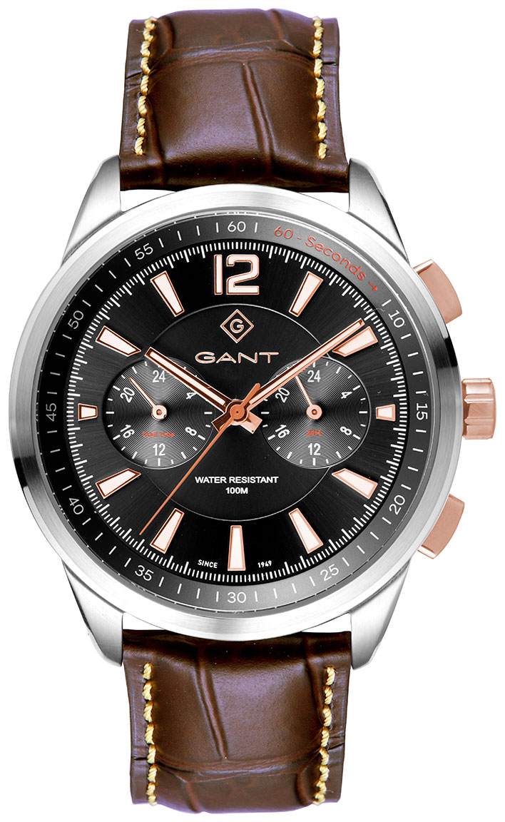 GANT Walworth G144001 on tyylikäs miesten rannekello, jossa on harmaa kellotaulu. Kellon teräsrunko on 44 mm leveä ja 11 mm paksu. GANT G144001 -kellon 22 mm leveä tikattu ruskea nahkaranneke on erittäin miellyttävä ranteessa. GANTin Walworth-kello kestää vettä 100 m saakka. Kaikilla GANT-kelloilla on kahden vuoden takuu, ja ne toimitetaan valmistajan alkuperäisessä rasiassa.