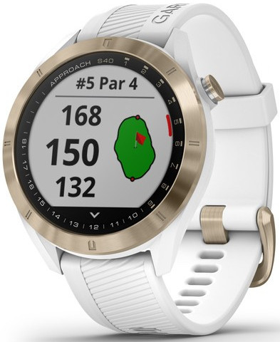 Garmin Approach S40 Light Gold with White Band 010-02140-02 goff-kello on kevyt ja käytännöllinen. Kellossa on 1,2 tuuman selkeälukuinen värikosketusnäyttö. Laitteseen on esiladattu 41000 kansainvälistä kenttää. Golf-kellossa on Autoshot pelianalyysitoimito, joka tallentaa löyntien pituudet ja sijainnit automaattisesti myöhempää analysointia varten. Kellon viheriönäkymässä lipun voi sijoittaa haluamaansa paikkaan ja laite näuttää etäisyydet viheriön etu- ja takalaitaan sekä keskikohtaan. Näet myös etäisyydet esteisiin ja doglegeihin. Laitteessa on lisäksi aktiivisisuusominaisuudet eli voit seurata esimerkiksi kertyviä askelia ja unta. Akku kestää 15 tuntia GPS-tilassa ja jopa 10 päivää älykellotilassa.