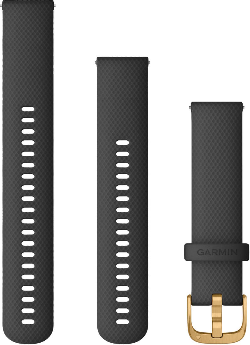 Garmin musta-kulta Quick release -silikoniranneke 20mm 010-12932-13. Rannekkeen silikoniosa on musta ja solki kullanvärinen. Pakkaus sisältää rannekkeen. Kiinnitys tapahtuu pikajousinastoilla, joten työkaluja ei tarvita. Ranneke sopii ranteisiin ympärysmitaltaa välillä 125-218mm.