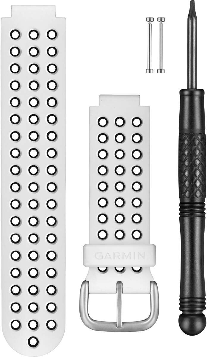 Garmin ranneke Approach S5-S6 010-12061-10 on valko-musta ranneke. Pakkaus sisältää rannekkeen, tapit ja vaihtotyökalun.