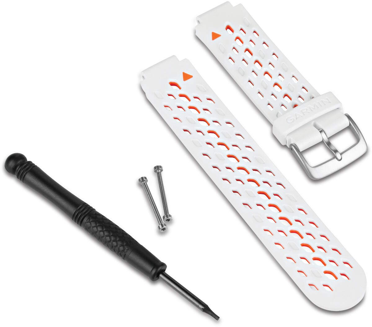Garmin ranneke Forerunner 620 010-11251-29 on valko-oranssi ranneke. Pakkaus sisältää rannekkeen, tapit ja vaihtotyökalun.
