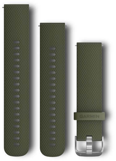 Garmin Vivoactive 3 ranneke 010-12561-00 sammalenvihreä. Pakkaus sisältää rannekkeen solkipuolen ja kaksi eripituista rei'itetty osaa. Kiinnitys tapahtuu pikajousinastoilla, joten työkaluja ei tarvita.