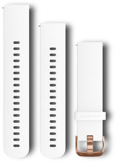 Garmin Vivoactive 3 ranneke 010-12561-05. Rannekkeen silikoniosa on valkoinen ja solki punakullan värinen. Pakkaus sisältää rannekkeen solkipuolen ja kaksi eripituista rei'itetty osaa. Kiinnitys tapahtuu pikajousinastoilla, joten työkaluja ei tarvita.