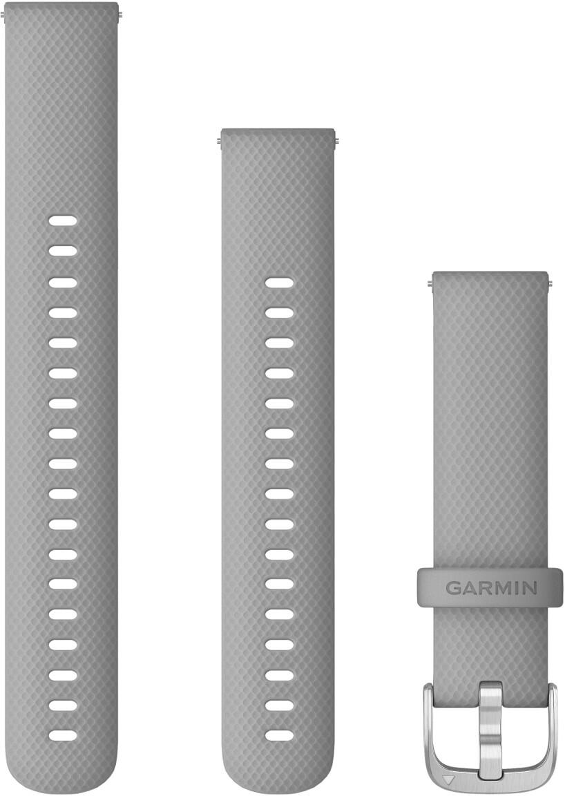 Garmin Vivoactive 4S utuharmaa Quick release -silikoniranneke 18mm 010-12932-00. Rannekkeen silikoniosa on utuharmaa ja solki hopeanvärinen. Pakkaus sisältää rannekkeen. Kiinnitys tapahtuu pikajousinastoilla, joten työkaluja ei tarvita. Sopii ranteisiin, joiden ympärysmitta on välillä 110-195mm.