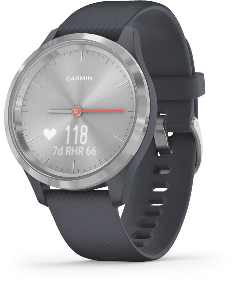 Garmin Vivomove 3S Granite Blue Silicone and Silver 010-02238-00 on pieni ja tehokas hybridiälykello, joka kätkee sisäänsä älykellon ominaisuudet. Vivomove 3 palvelee työpäivän aikana antaen kalenteri-ja muita älykkäitä ilmoituksia. Kellossa on helppokäyttöinen kaksoiskosketusnäyttö, ja kevyt 3,9. cm leveä runko, joka on vain 1,1 cm paksu, ja kello on valmistettu ensiluokkaisista materiaaleista. Nopeasti vaihdettavien quick release-rannekkeiden avulla vaihdat tyyliä käden käänteessä siirtyessäsi töistä salille tai juhliin.