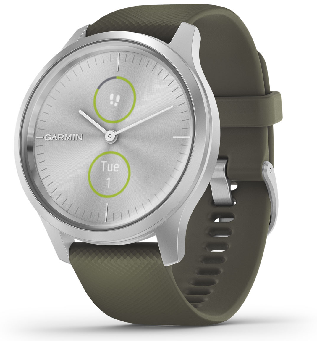 Garmin Vivomove Style Moss Green Silicone and Silver 010-02240-01 -hybridiälykello näyttää perinteiseltä tyylikkäältä analogiselta kellolta, joka palvelee työpäivän aikana antaen kalenteri-ja muita älykkäitä ilmoituksia ja jolla maksat kätevästi ostokset, ja samalla se kätkee sisäänsä älykellon ominaisuudet ja kaksoiskosketusnäytön, joiden avulla treenaat, liikut, ja seuraat edistymistäsi – kaikki yhdessä paketissa. Garmin Vivomove on valmistettu ensiluokkaisista materiaaleista – ja nopeasti vaihdettavien quick release-rannekkeiden avulla vaihdat tyyliä käden käänteessä siirtyessäsi töistä salille tai juhliin.