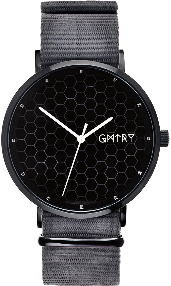 Tämä vilkkaaseen kaupunkimaisemaan luotu miesten rannekello on osa GMTRY:n alkuperäistä Polygon Series -mallistoa. Uniikki ja minimalistinen design on saanut vaikutteita urbaanista ympäristöstä, rakennusten muodoista ja värikkäästä katukuvasta. Black/Grey -mallissa on musta runko ja kellotaulu sekä vaaleanharmaa ranneke. Runko on valmistettu ruostumattomasta teräksestä ja sen halkaisija on 45 mm. Kankaisella Nato-rannekkeella puolestaan leveyttä on 22 mm.
