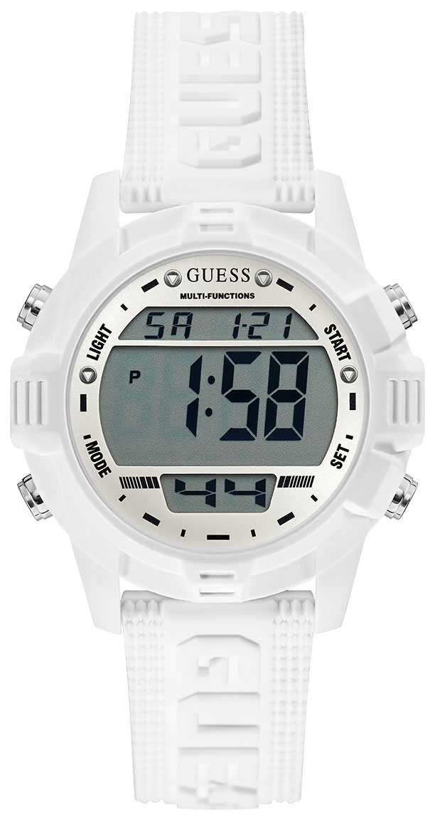 GUESS Boost GW0015L1 naisten valkoinen digitaalikello. Kellon polykarbonaatista valmistettu valkoinen runko on 40 mm leveä ja 13,5 mm paksu. Rannekkeena tässä mallissa on 19 cm pitkä mukavan tuntuinen valkoinen silikoniranneke, jonka leveys kiinnityskohdasta on 20 mm. Mineraalilasin alla suojassa on klassisen retro digitaalinäyttö. GUESS-kelloilla on 2 vuoden takuu, ja ne toimitetaan valmistajan alkuperäisessä rasiassa.