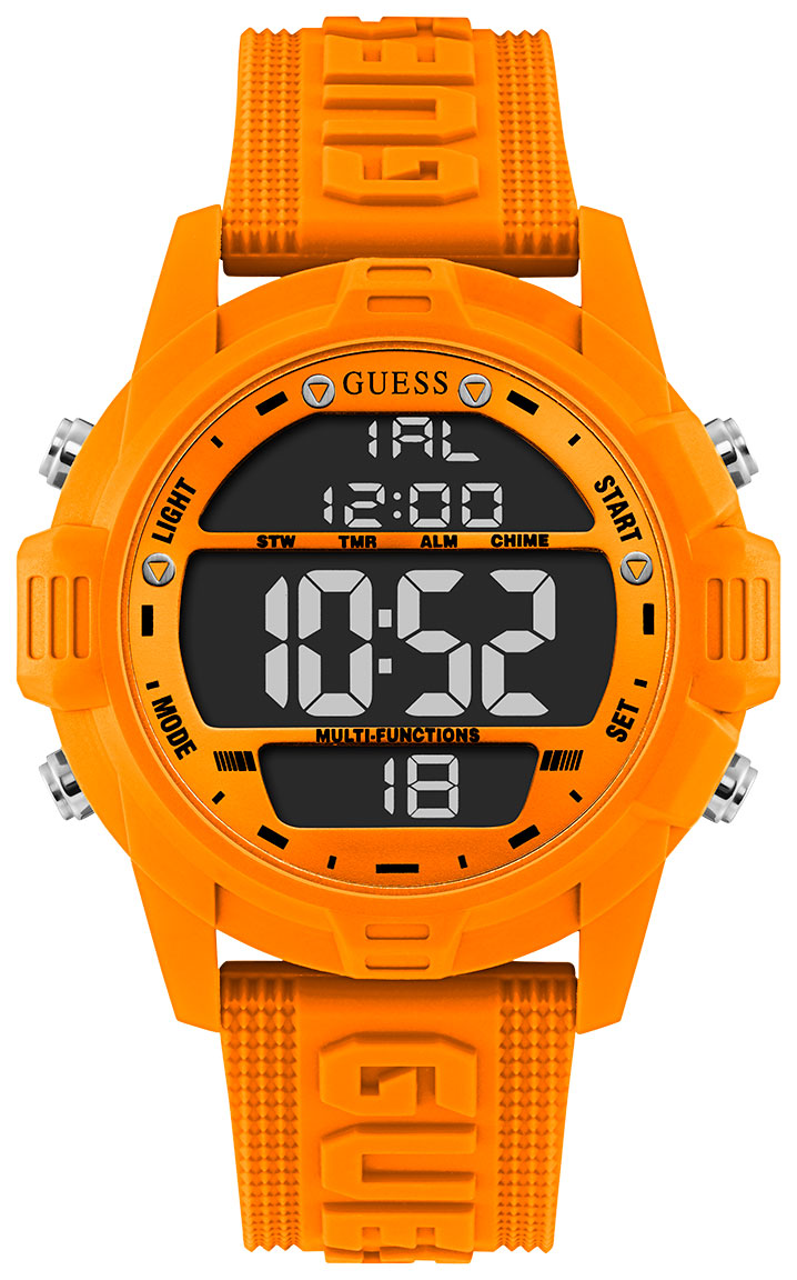 GUESS Charge GW0050G3 miesten oranssi digitaalikello. Kellon polykarbonaatista valmistettu oranssi runko on 48 mm leveä ja 15 mm paksu. Rannekkeena tässä mallissa on 19 cm pitkä mukavan tuntuinen oranssi silikoniranneke, jonka leveys kiinnityskohdasta on 24 mm. Mineraalilasin alla suojassa on klassisen retro digitaalinäyttö. GUESS-kelloilla on 2 vuoden takuu, ja ne toimitetaan valmistajan alkuperäisessä rasiassa.