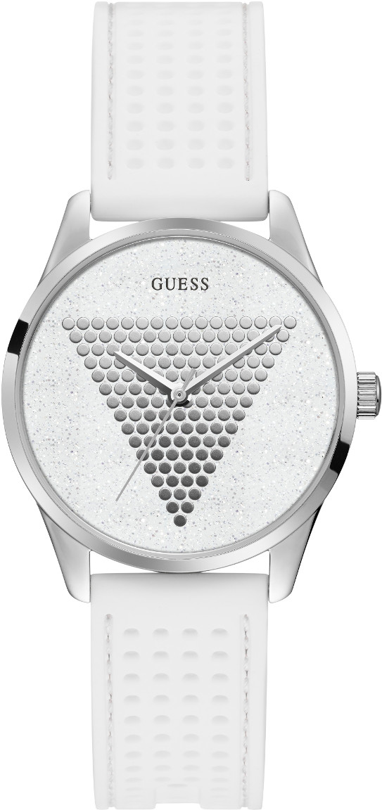 GUESS Mini Imprint W1227L1 -rannekello tarjoaa loistetta koko rahalla! Tämän takaa kellotaulun kimaltava glitter-pinta. Hopeanvärinen runko on halkaisijaltaan 36 mm ja valmistettu ruostumattomasta teräksestä. 18 mm leveässä rannekkeessa on käytetty materiaalina miellyttävän pehmeää silikonia. Koneisto tässä mallissa on japanilainen ja näin ollen myös erittäin korkeaa laatua.