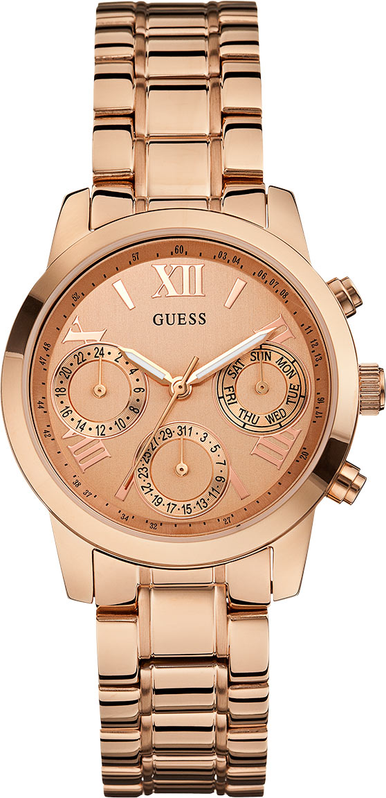 GUESS W0448L3 Mini Sunrise on väritykseltään tyylikäs punakultainen. Kellotaulua koristavat tyylikkäät roomalaiset numerot. Rannekello on materiaaliltaan ruostumatonta terästä ja ominaisuuksina kellossa on päivyri, viikonpäivänäyttö sekä 24h näyttö. Guess- kelloille myönnetään 2 vuoden takuu ja ne toimitetaan valmistajan alkuperäisessä rasiassa.