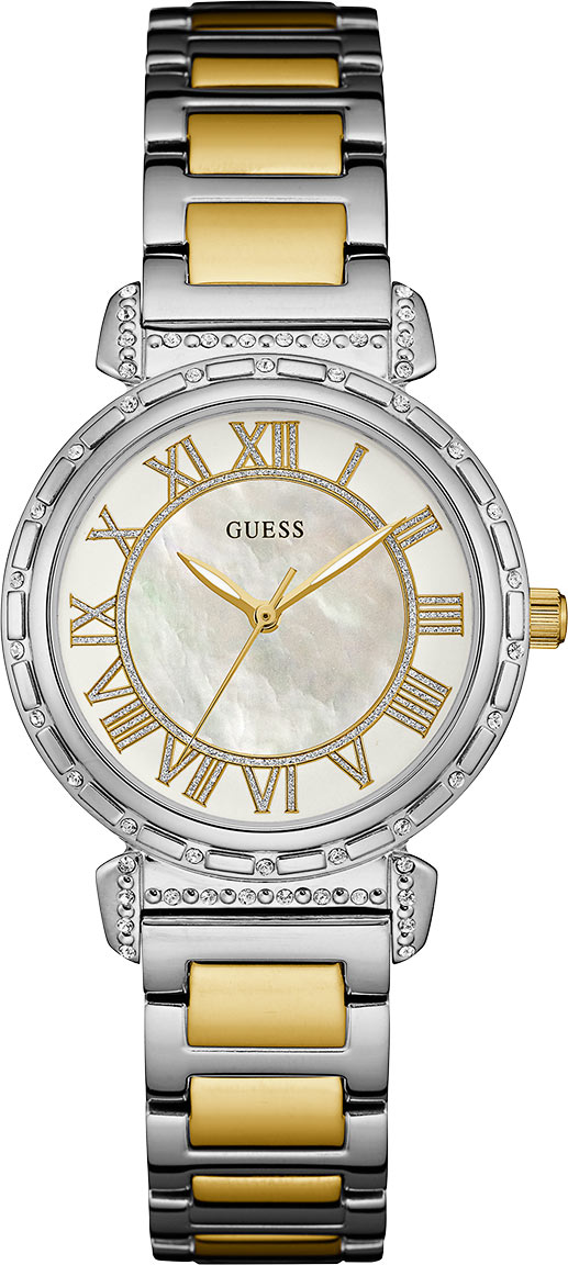 Guess W0831L3 South Hampton kellossa on kaunis vaalea helmiäiskellotaulu ja kaksivärinen ranneke. Zirconia korukivillä koristeltu runko on hyvin näyttävä. Rannekkeen leveys kiinnityskohdasta on 16mm. Kellon rungon leveys on 34mm ja paksuus 9mm. Guess- kelloille myönnetään 2 vuoden takuu ja ne toimitetaan valmistajan alkuperäisessä rasiassa.