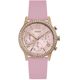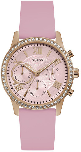 GUESS W1135L2 Solar -rannekellossa on hurmaavan pehmeä, vaaleanpunainen kumiranneke ja punakullan värisillä indekseillä tyylitelty kellotaulu. 40 mm teräsrunkoa koristavat kirkkaat zirkoniat. Tästä mallista löytyvät lisäksi päivämäärälle, viikonpäivälle ja 24 h ajalle pyhitetyt taulut. Saatavilla myös valkoisena.