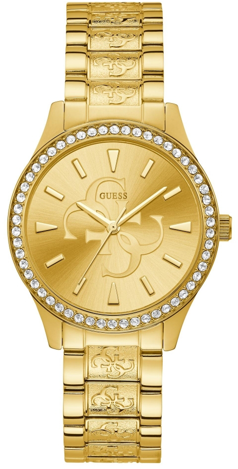 Guess W1280L2-rannekellossa on kullansävyinen näyttö, jossa on 1980-luvulle tyypilliset viivamaiset, minimalistiset, miltei jopa maskuliiniset indeksit ja 3D-tekniikalla painettu Guessin logo. Kellon kehään on upotettu kristalleja ja logopainatus jatkuu kellon teräsrannekkeessa. Rungon leveys on 38 mm, ja rannekkeen kiinnityskohdan leveys on 10 mm. GUESS-kelloilla on 2 vuoden takuu, ja ne toimitetaan valmistajan alkuperäisessä rasiassa.