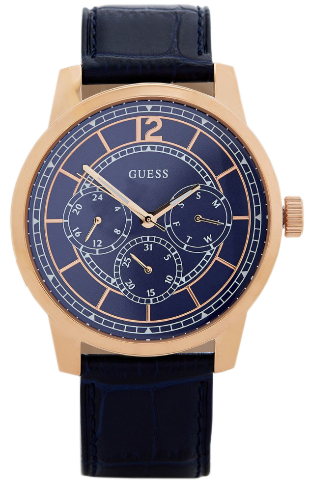 Guess W1306G1 on klassinen ja tyylikäs puvunkello. Runko on 42 mm leveä ja sinisestä taulusta löytyy perinteisen kellon lisäksi päivämäärä, 24 tunnin kello ja viikonpäivänäyttö. 22 mm leveä ranneke on valmistettu krokotiilikuvioidusta nahasta. Ranneke on pituudeltaan 17-22 mm. GUESS-kelloilla on 2 vuoden takuu, ja ne toimitetaan valmistajan alkuperäisessä rasiassa.