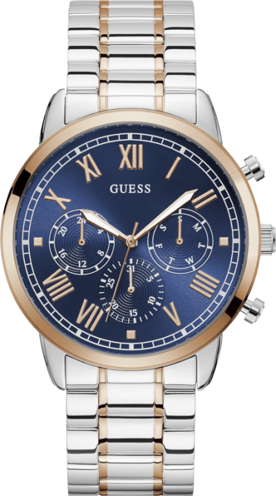 Guess W1309G4 miesten teräsrannekellossa on tyylikäs kaksivärinen ilme, syvänsininen kellotaulu, ja roomalaiset indeksit. Kellon viisarit on luminoitu ja kellon lisäksi talussa on erilliset näytöt 24 tunnin kellolle, viikonpäivälle ja päivämäärälle, jotka tekevät ajanseuraamisesta erityisen helppoa. Rungon leveys on 44 mm ja rannekkeen kiinnityskohdan leveys on 22 mm, ja rannekkeessa on turvalukko. GUESS-kelloilla on 2 vuoden takuu, ja ne toimitetaan valmistajan alkuperäisessä rasiassa.