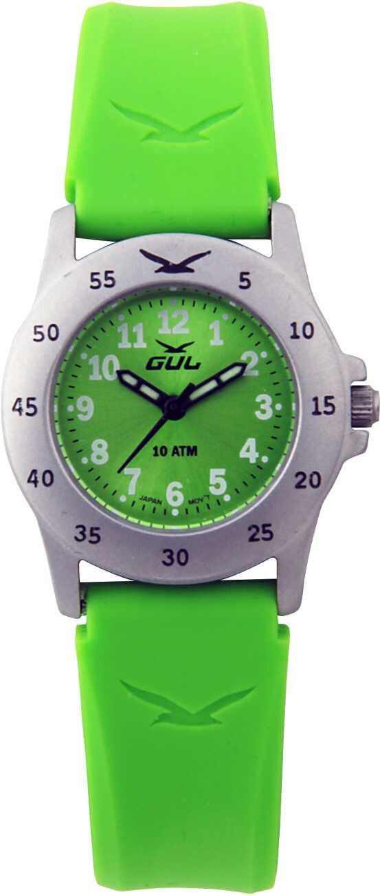 GUL Micro Silicone 4177375 Green-rannekello on suunniteltu lapsille. Kellossa on vihreä kellotaulu ja silikoniranneke, ja runko on valmistettu ruostumattomasta teräksestä ja takakansi on titaanista, jonka vuoksi kello sopii herkällekin iholle. Rungon leveys on 28 mm ja paksuus 8,5 mm, rannekkeen pituus on 13-18 cm ja paksuus 16mm. Kellossa on laadukas Miyota 2035-koneisto ja kello kestää vettä 1000 m saakka. Gul-rannekelloilla on kahden vuoden takuu, ja ne toimitetaan valmistajan alkuperäisessä rasiassa.