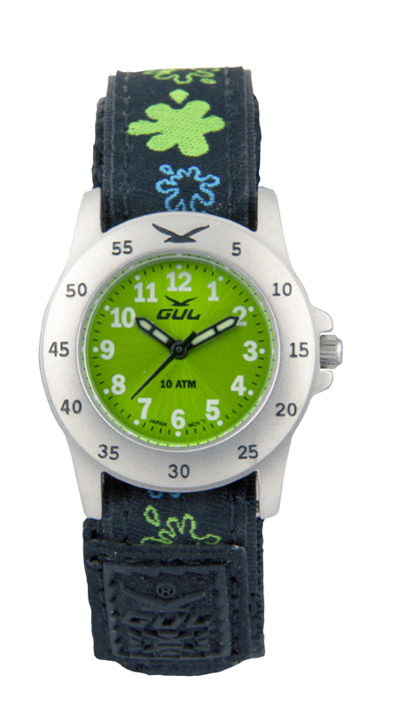 GUL Micro Velcro 4159375 Green suunniteltu lapsille. Kellossa on vihreä kellotaulu ja kuvioitu tekstiiliranneke, ja runko on valmistettu ruostumattomasta teräksestä ja takakansi on titaanista, jonka vuoksi kello sopii herkällekin iholle. Rungon leveys on 28 mm ja paksuus 8,5 mm, rannekkeen paksuus 16mm ja tarrakiinnityksen ansiosta se sopii pienellekkin ranteelle (min. 10 cm). Kellossa on laadukas Miyota 2035-koneisto ja kello kestää vettä 100 m saakka. Gul-rannekelloilla on kahden vuoden takuu, ja ne toimitetaan valmistajan alkuperäisessä rasiassa.
