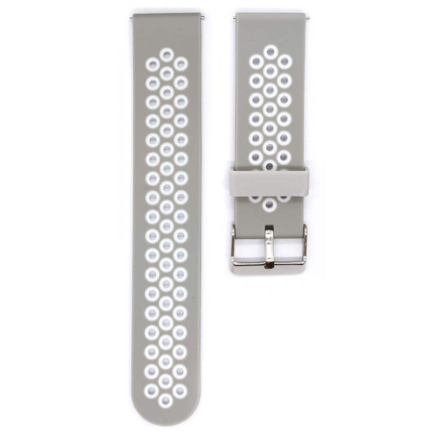 Tämä harmaa-valkoinen silikoniranneke on ihoystävällinen ja hengittää hyvin. Sporttinen ulkonäkö on omiaan tuomaan uutta ilmettä kelloosi. Rannekkeessa on pikakiinnitys, jonka ansiosta vaihto sujuu käden käänteessä.
