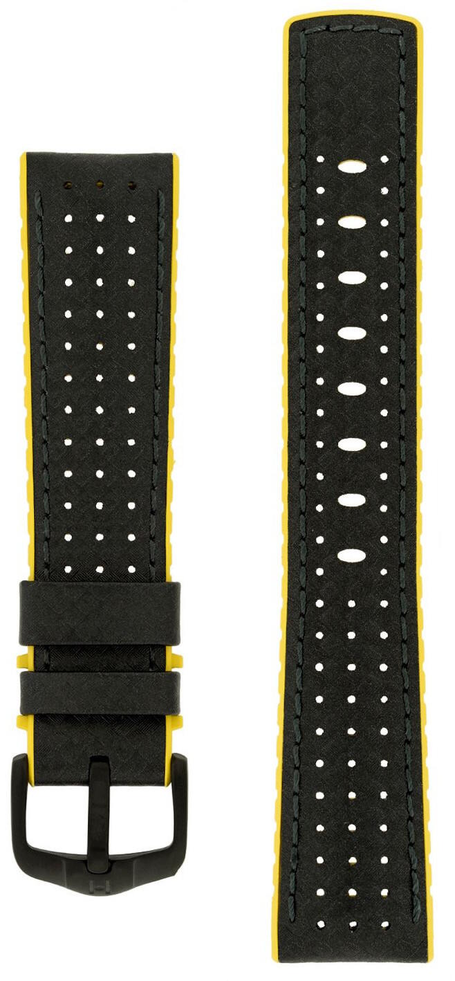 Sporttinen Hirsch Ayrton 091 72 92 0 50 on rei'itetty mustakeltainen vasikannahkaranneke, jonka alapuoli on kautsusta eli raakakumista. Sporttisen ulkonäön lisäksi ranneke on vedenkestävä aina 300 metriin saakka, joten se sopii hyvin myös märempiin urheilusuorituksiin. Ranneketta on saatavilla 20 mm, 22 mm ja 24 mm levyisenä. Leveys on mitattu rannekkeen leveämmästä päästä, josta se kiinnitetään kellon runkoon. Rannekkeen nahkaosien yhteispituus on 20 cm. Hirsch-rannekkeille myönnetään 1 vuoden takuu, joka kattaa valmistus ja materiaaliviat.