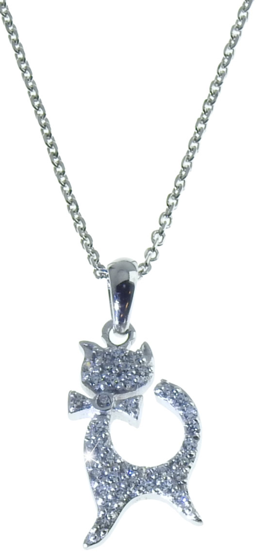 Suloinen kissariipus sirolla ankkuriketjulla. Koru on valmistettu rodinoidusta 925 sterling-hopeasta, joten se ei pääse tummumaan ajan kuluessa. Korussa oleva kissariipus on koristeltu kirkkailla synteettisillä zirkonioilla. Riipuksen korkeus on 22mm ja leveys 13mm. Hopeisen ketjun paksuus on 1mm ja se on 45cm pitkä.